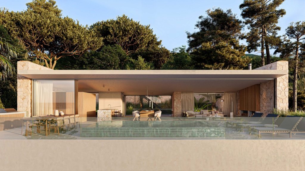 Auf einem steil abfallenden Grundstück in einer der höchstgelegenen Gegenden Mallorcas gelegen, versucht dieses Haus, die Höhe optimal zu nutzen, um vom Hauptgeschoss aus einen Panoramablick auf das Meer zu genießen.
