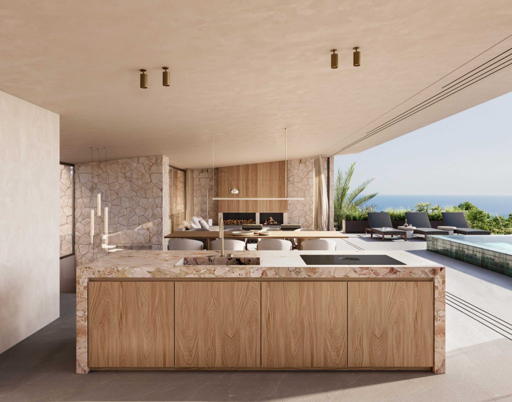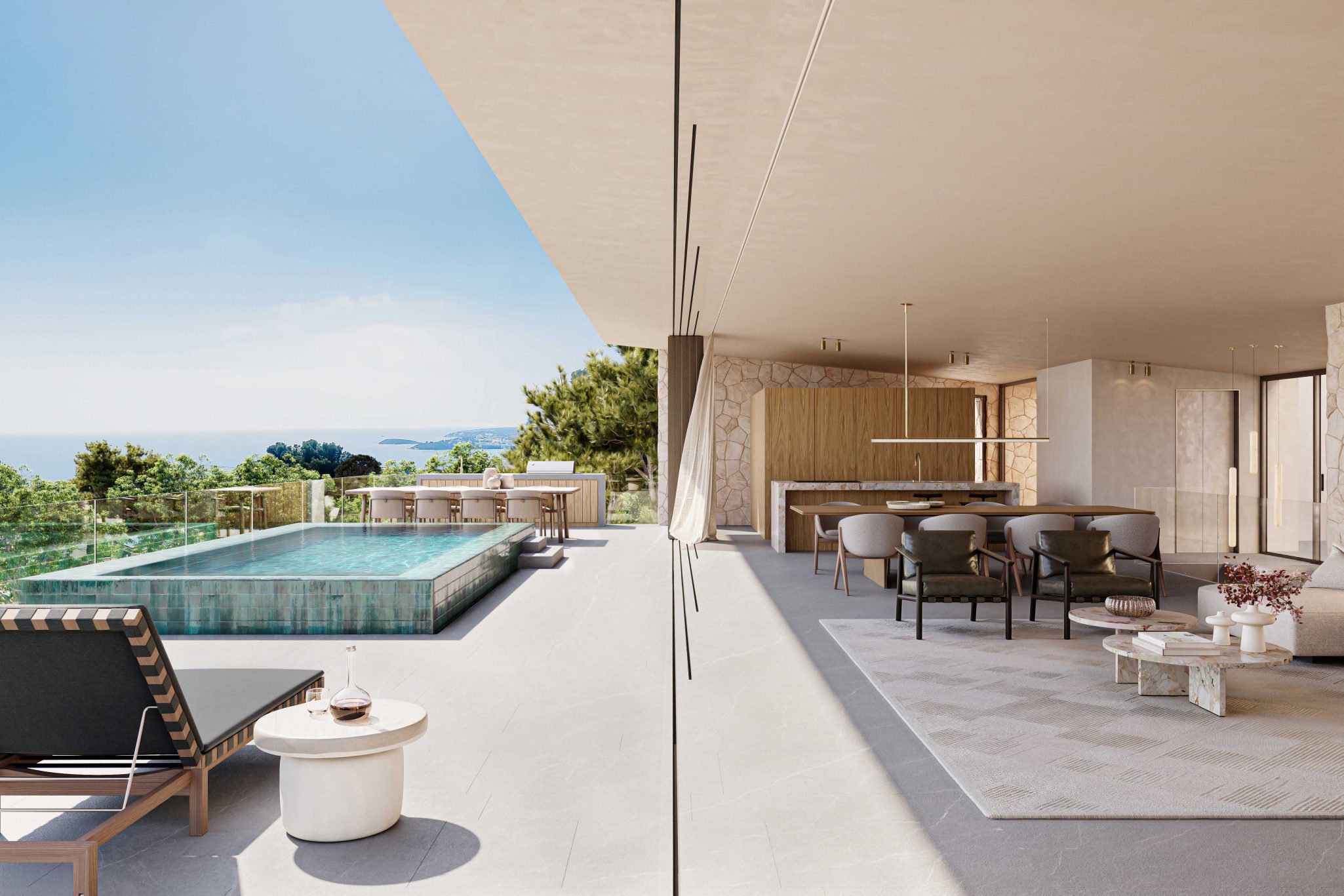Im Hauptgeschoss befindet sich ein integrierter Raum, der ein Wohnzimmer, ein Esszimmer und eine Küche umfasst, mit großen Schiebefenstern, die, wenn sie geöffnet werden, den Innenraum mit einer weitläufigen Terrasse mit einem Infinity-Pool verbinden. Von dieser Ebene aus hat man Zugang zum Dach, das sich als begehbare Terrasse präsentiert.
