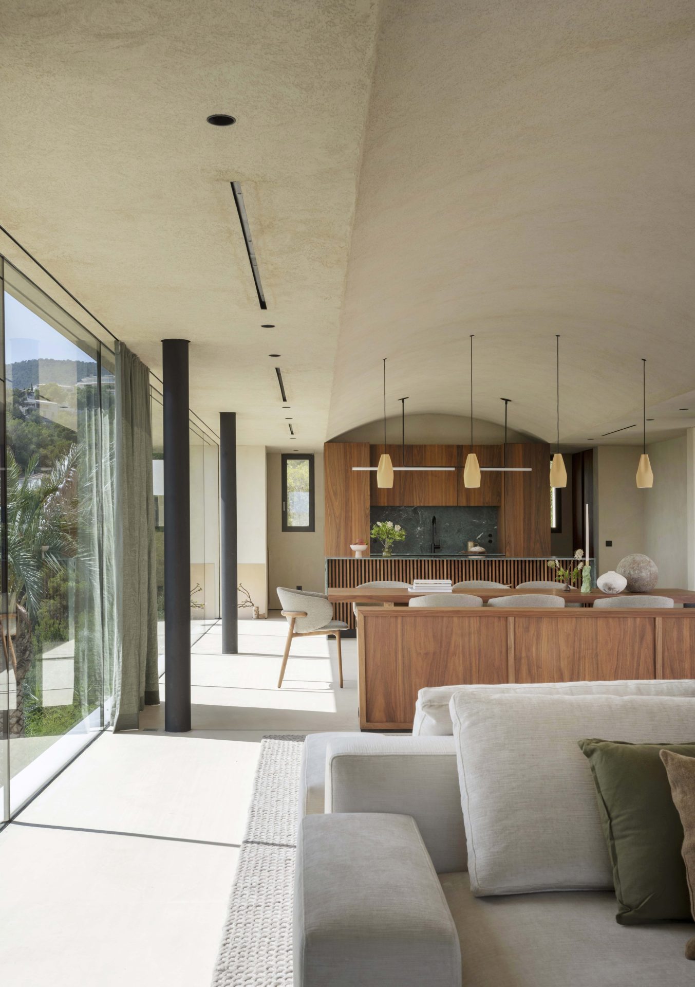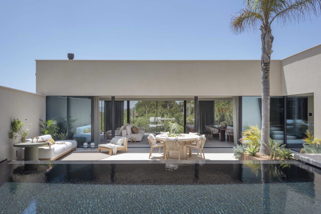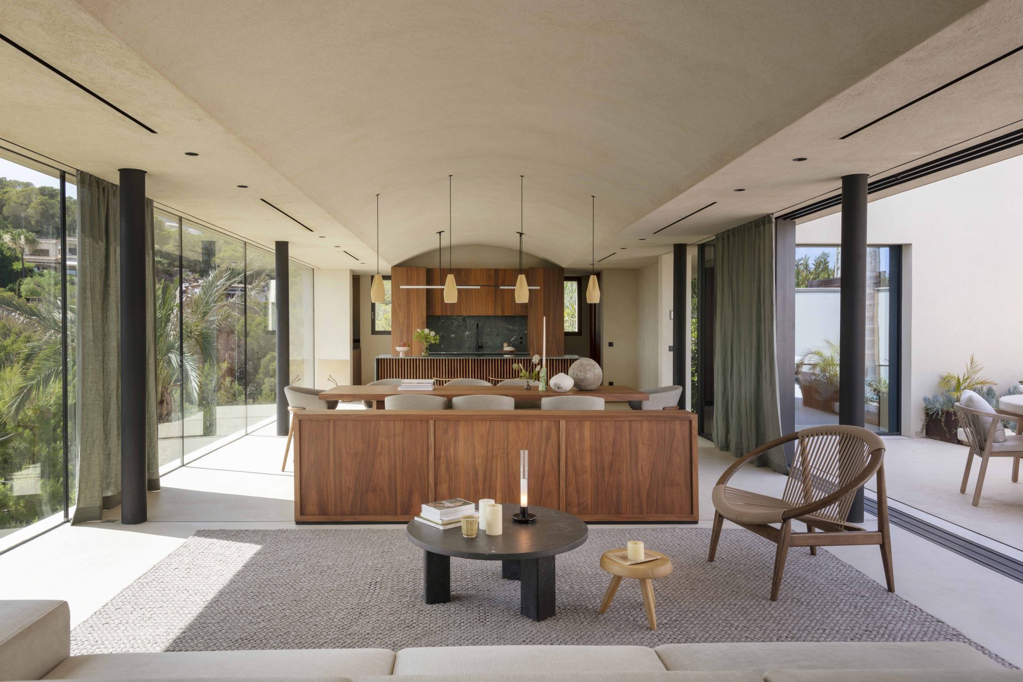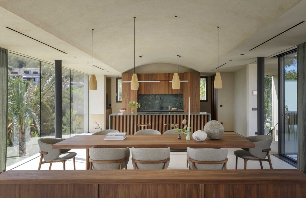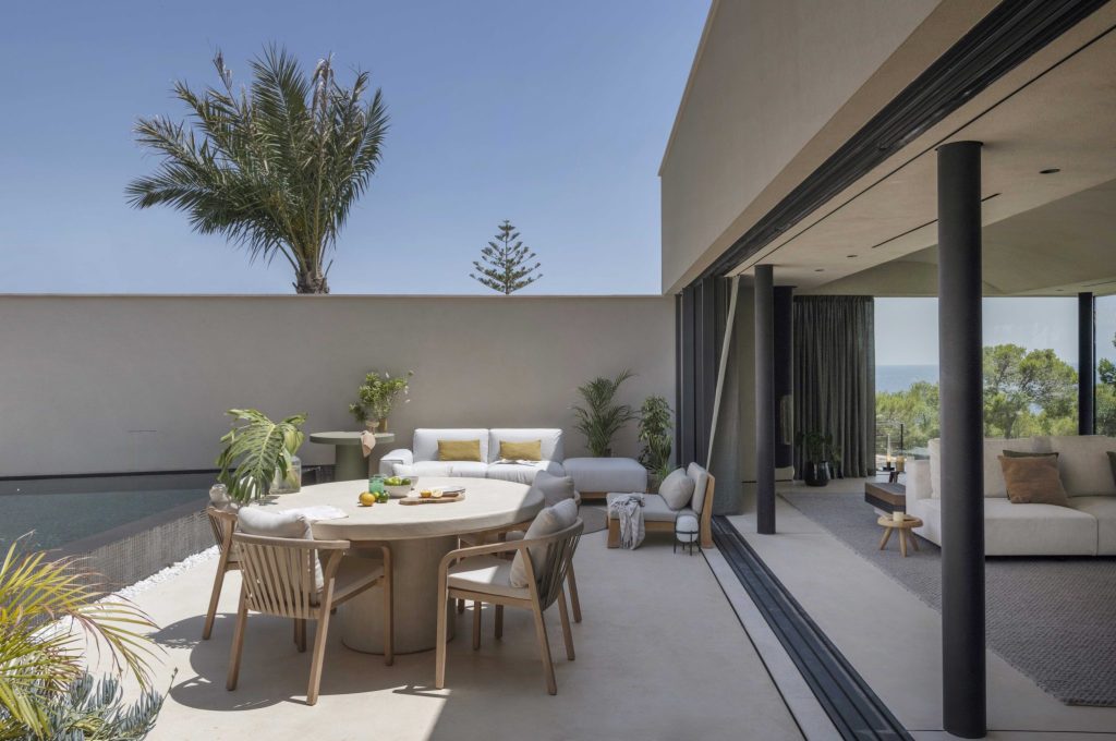 En la planta principal, se encuentra un espacio integrado que incluye salón, comedor y cocina, con amplios ventanales correderos que, al abrirse, conectan el interior con un jardín en el interior de la parcela con piscina, que disfrutar del espacio exterior y de las vistas al mar sin percibir el ruido de la autopista.