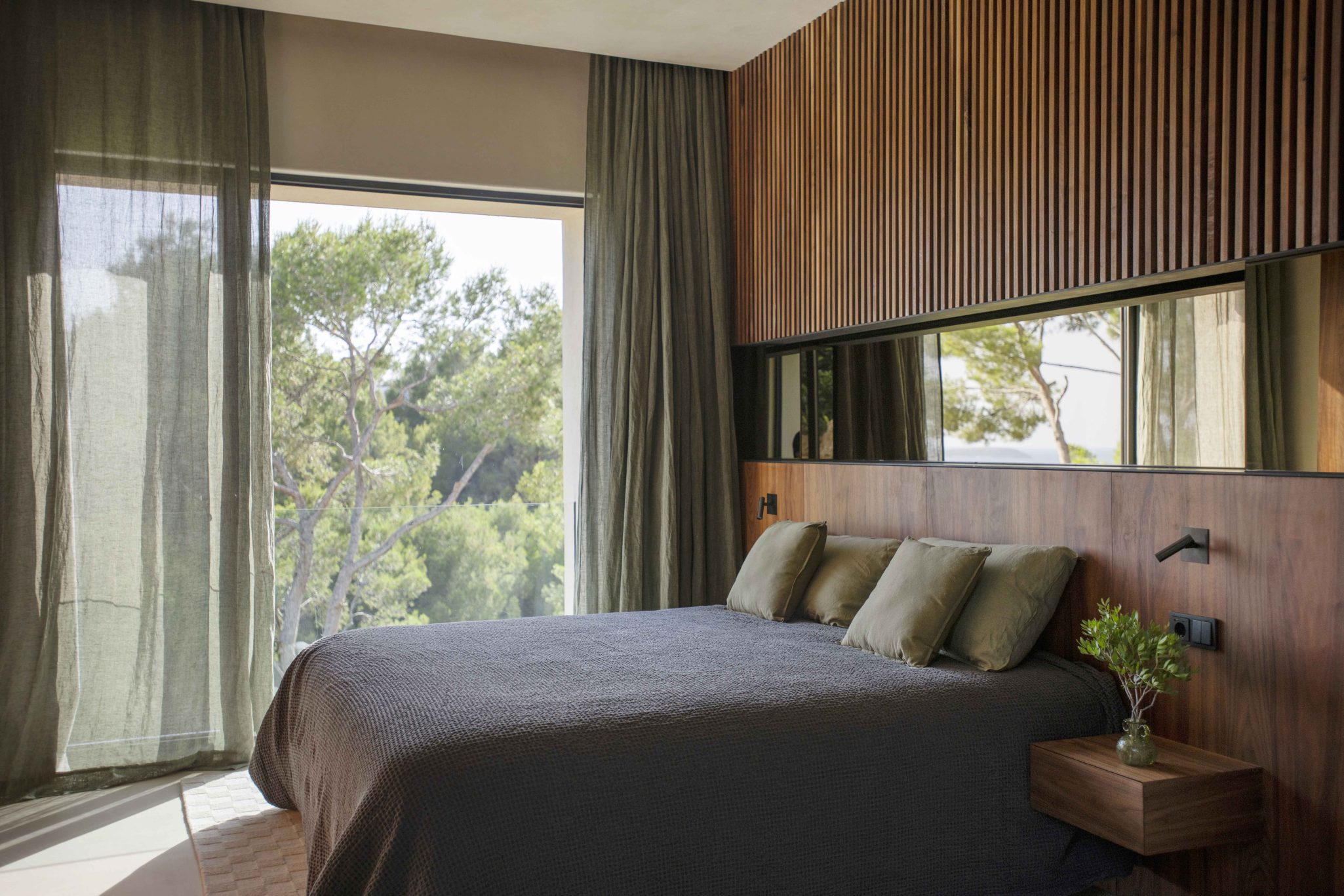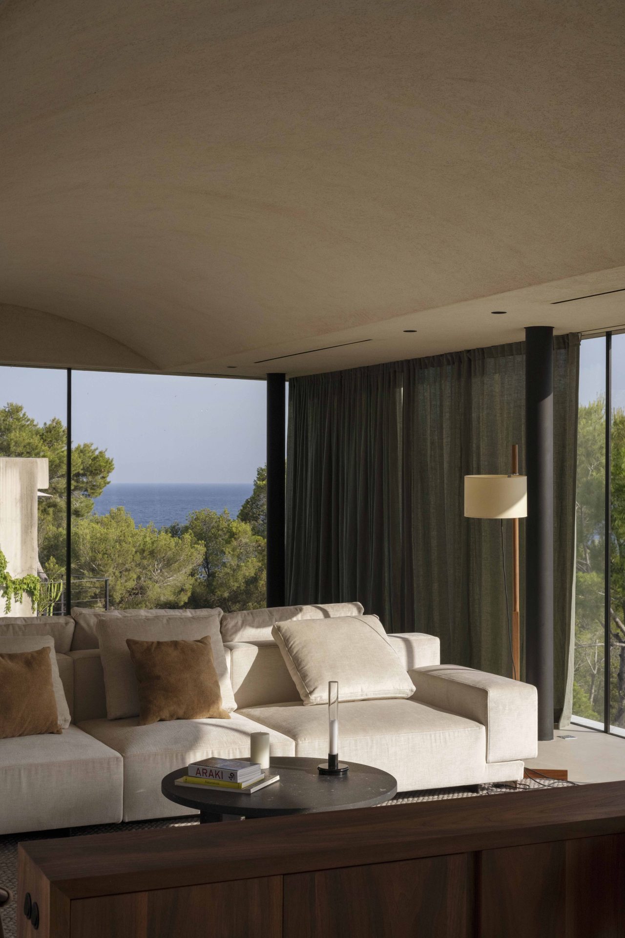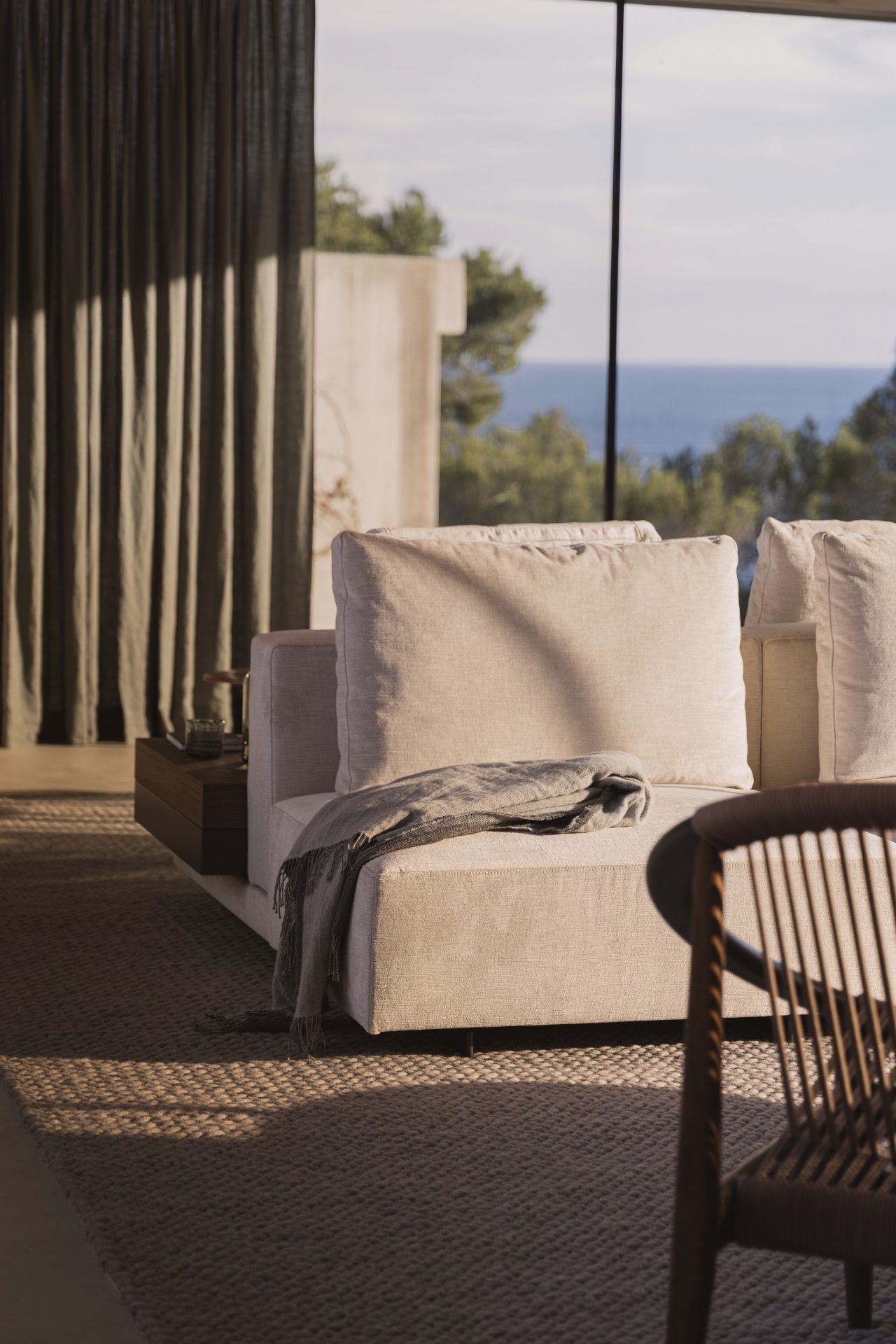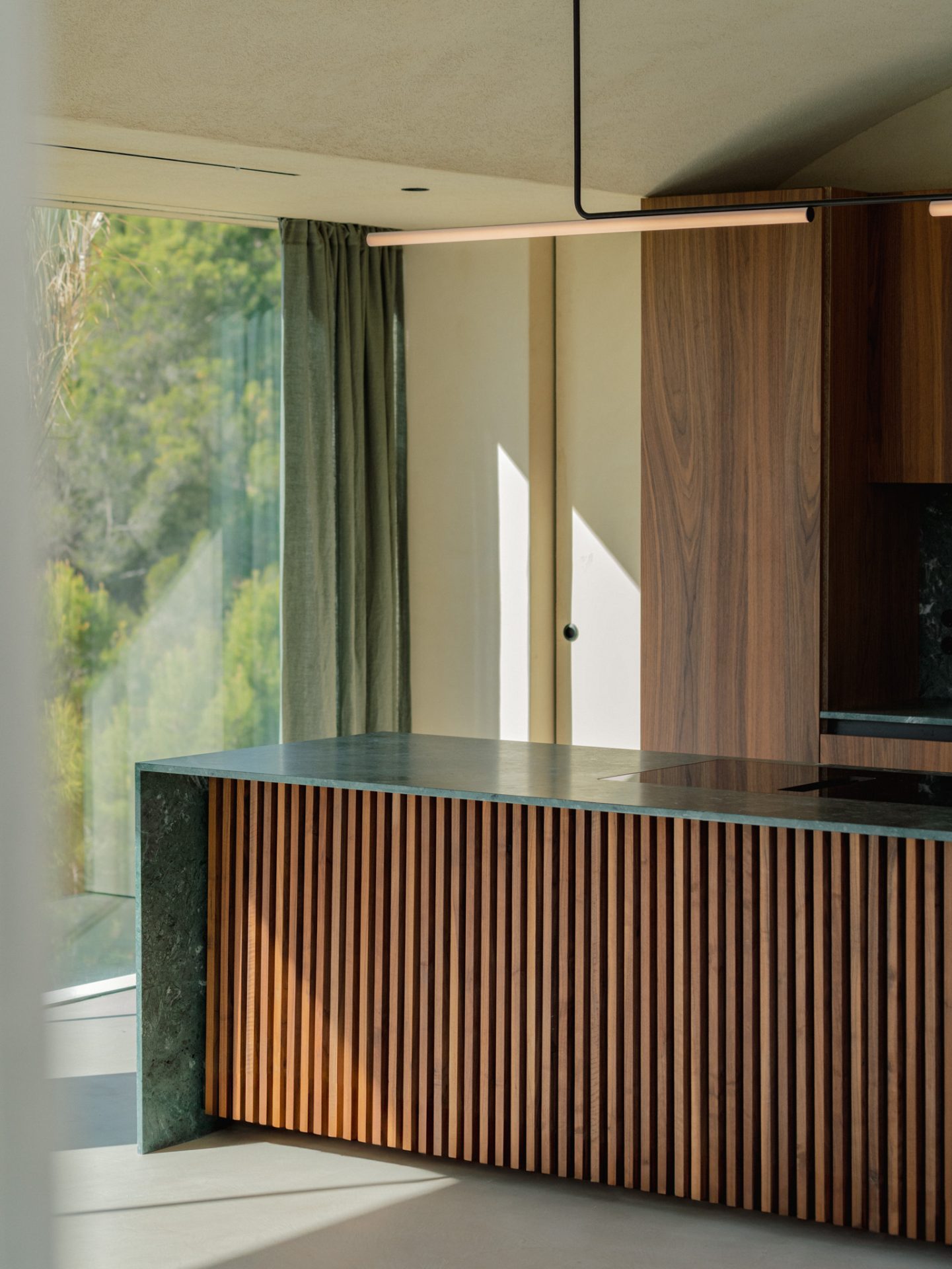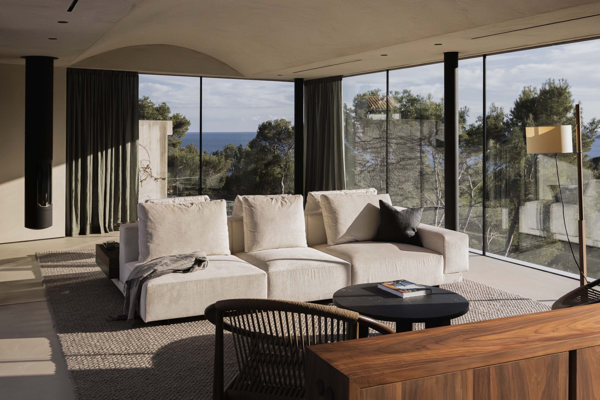 En la planta principal, se encuentra un espacio integrado que incluye salón, comedor y cocina, con amplios ventanales correderos que, al abrirse, conectan el interior con un jardín en el interior de la parcela con piscina, que disfrutar del espacio exterior y de las vistas al mar sin percibir el ruido de la autopista.