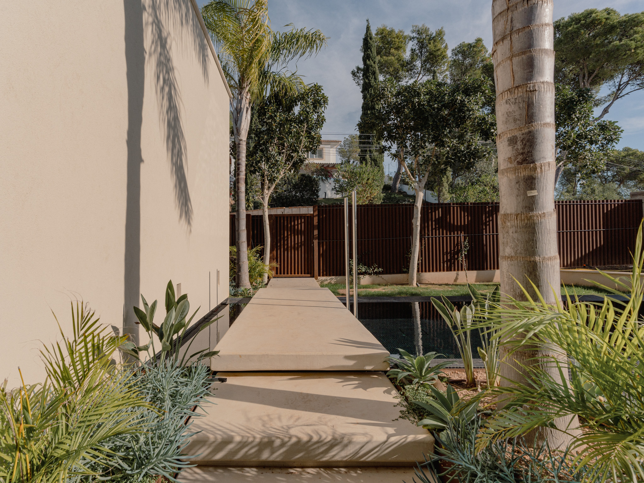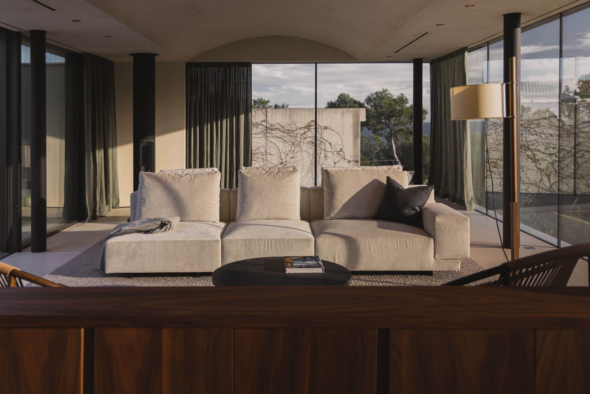 La construcción de esta vivienda se llevó a cabo en un terreno con una marcada pendiente y la constante banda sonora de la cercana autopista. La solución que se propuso ante estos desafíos fue posicionar la vivienda como una especie de escudo acústico, reservando la zona trasera para un acogedor jardín y una piscina, todo ello al nivel de la planta principal, desde donde se disfruta de una vista encantadora.
